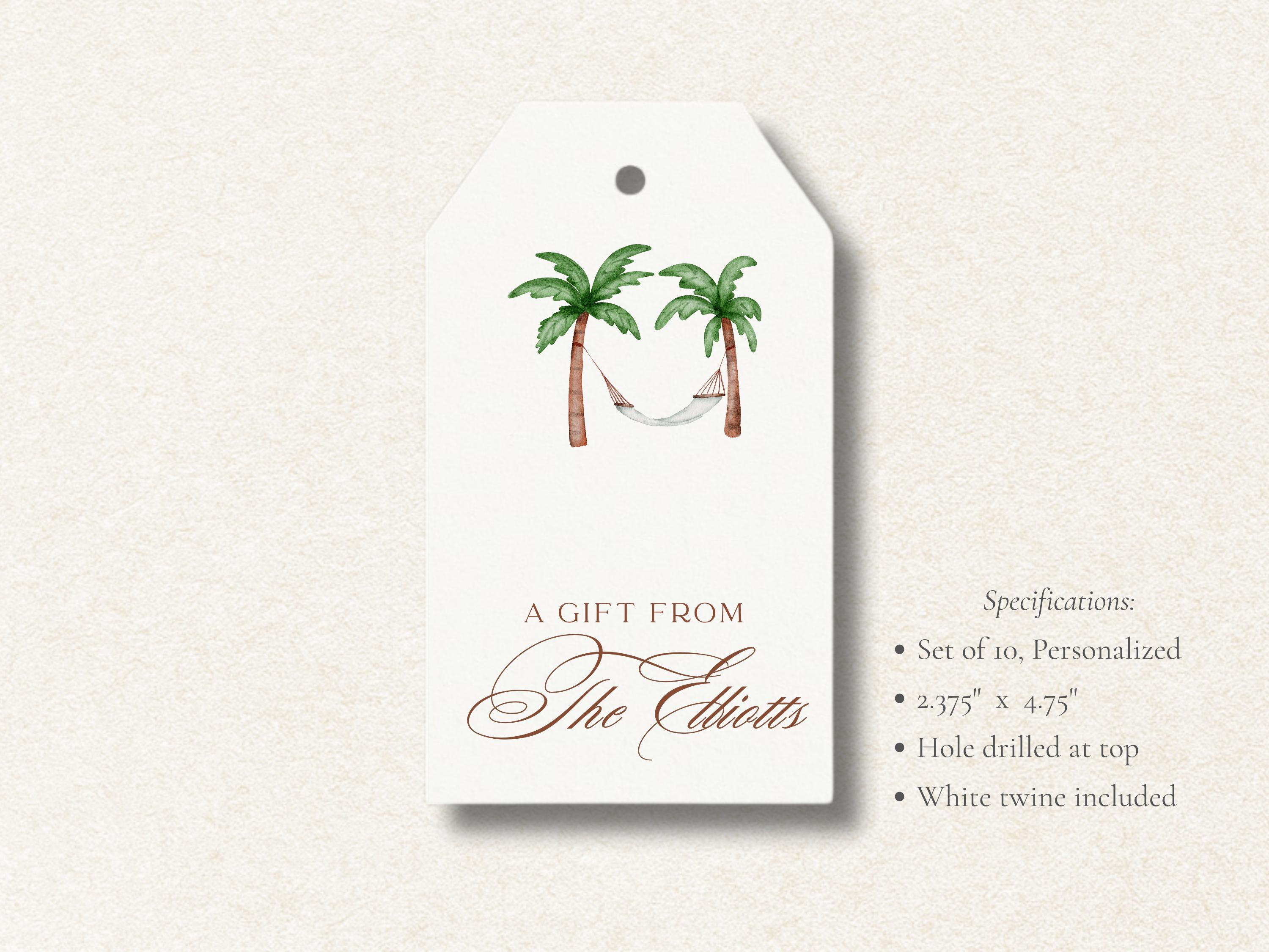 Add timeless elegance to your gifting with these personalized palm tree gift tags | Featuring a hand-painted watercolor design of two palms with a hammock, each tag is customized with your name or message for a coastal-inspired touch | Perfect for tropical weddings, beach parties, vacation homes, or thoughtful hostess gifts, each tag is created with care to reflect your personal style.