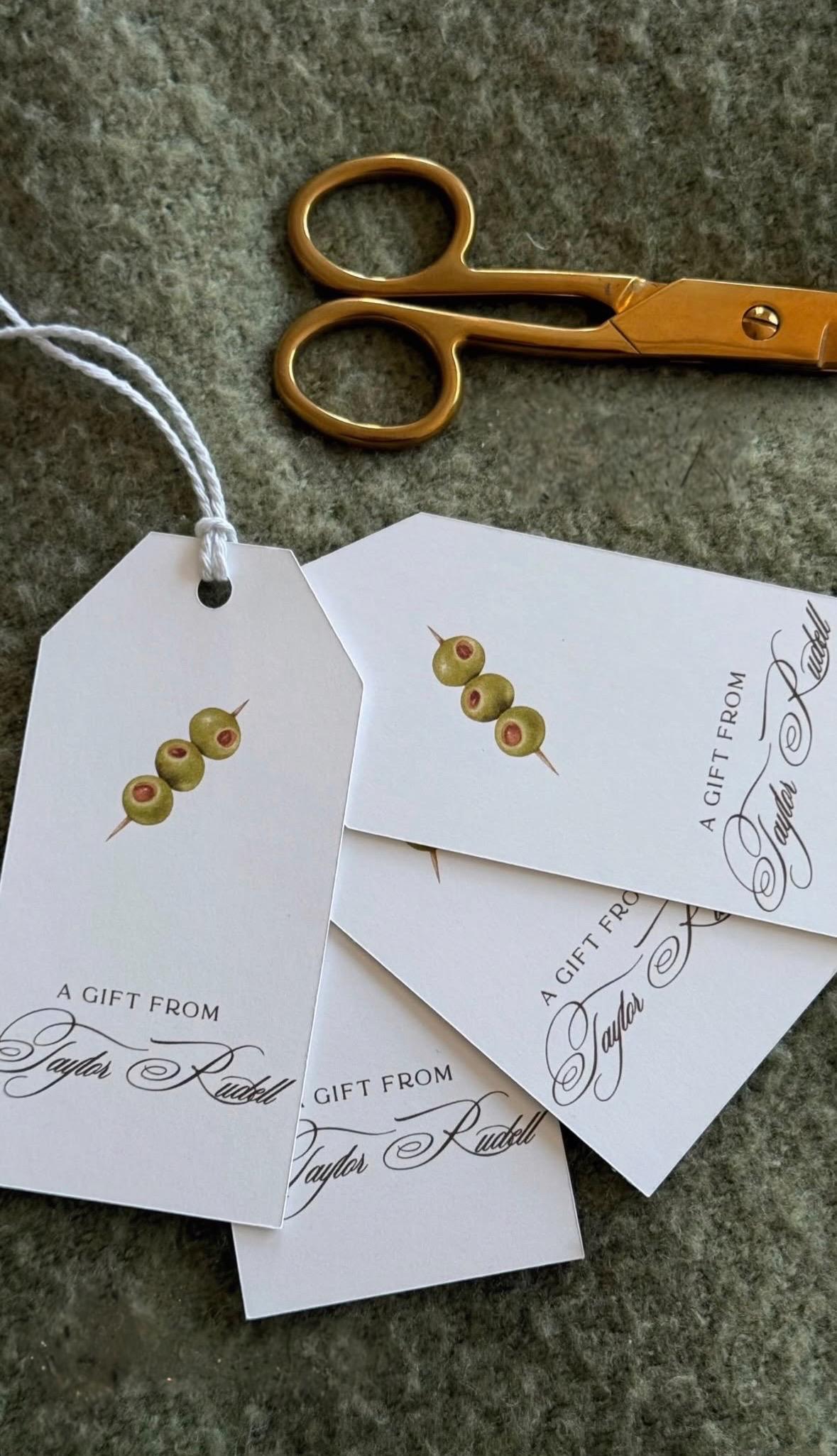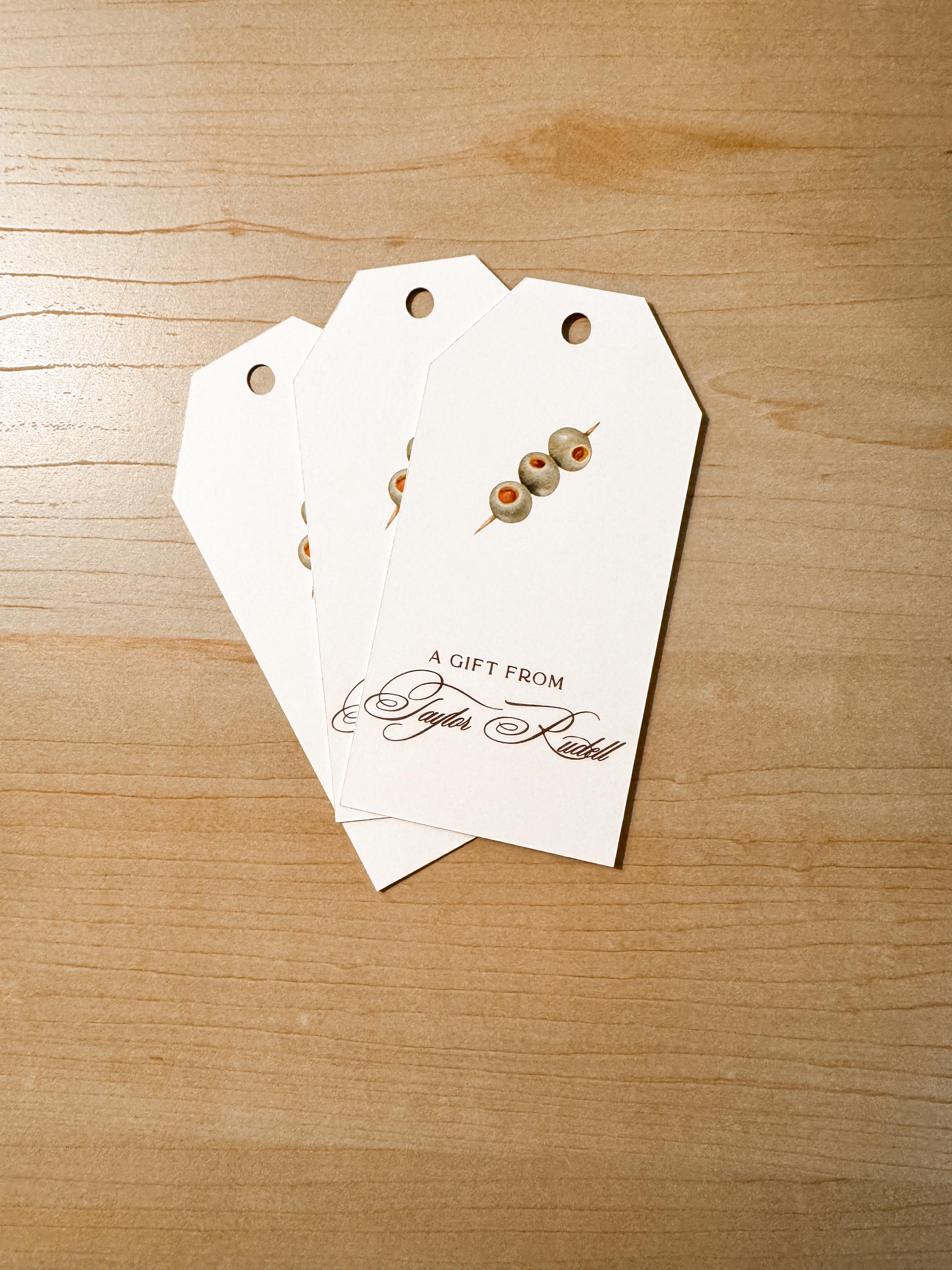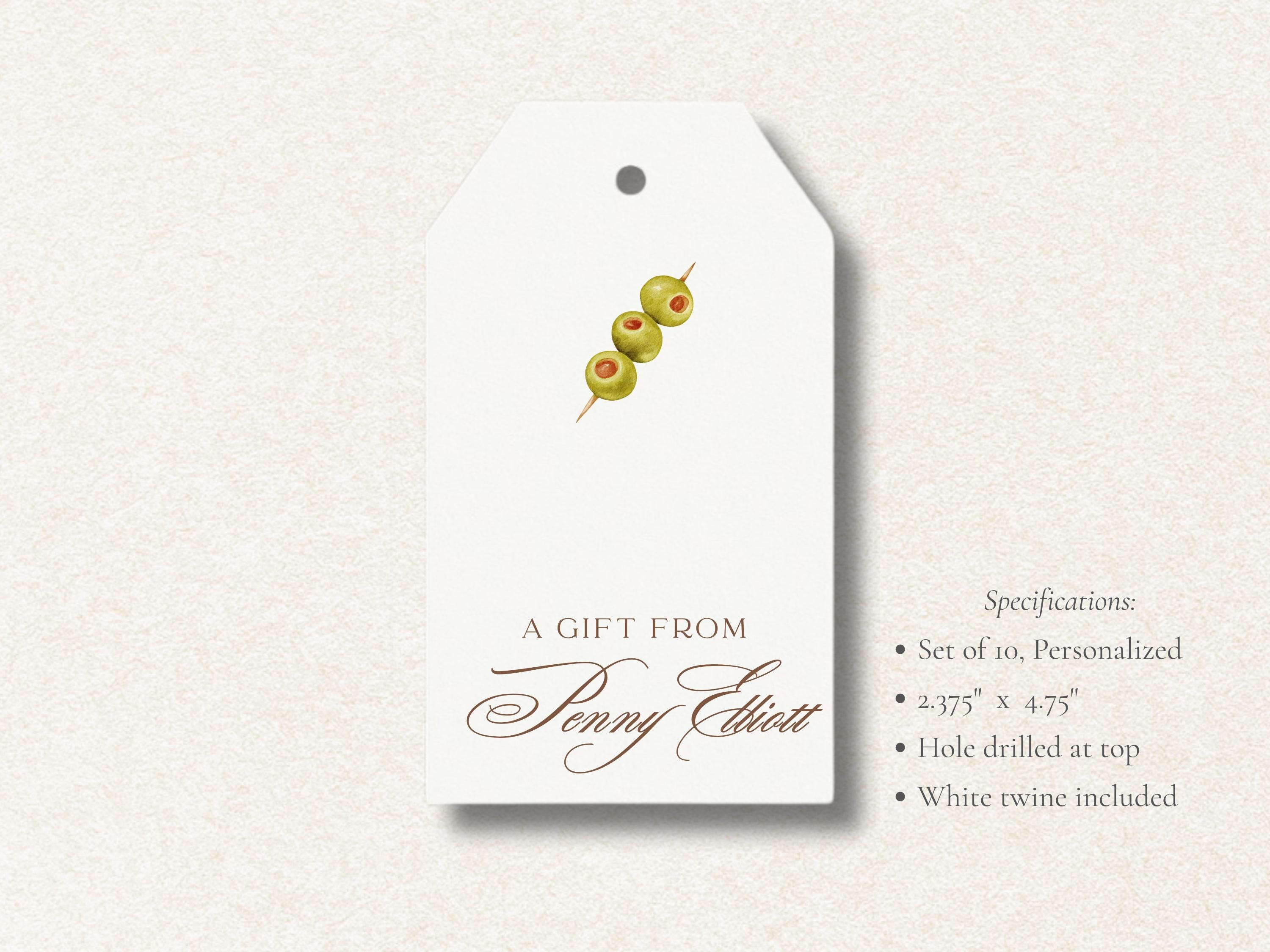 Add a chic, playful touch to your gifting with these personalized olive gift tags | Featuring a hand-painted watercolor illustration of green martini olives on a cocktail pick, each tag is customized with your name or message for a fun, spirited style | Perfect for cocktail parties, martini nights, hostess gifts, or bar cart styling, each tag is created with care to reflect your personal taste.