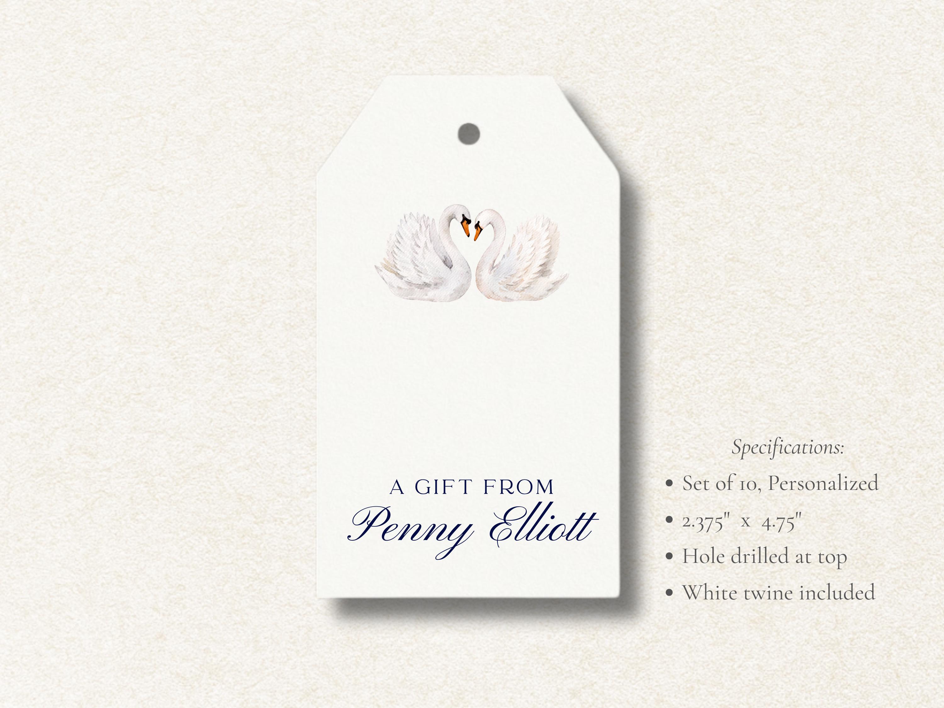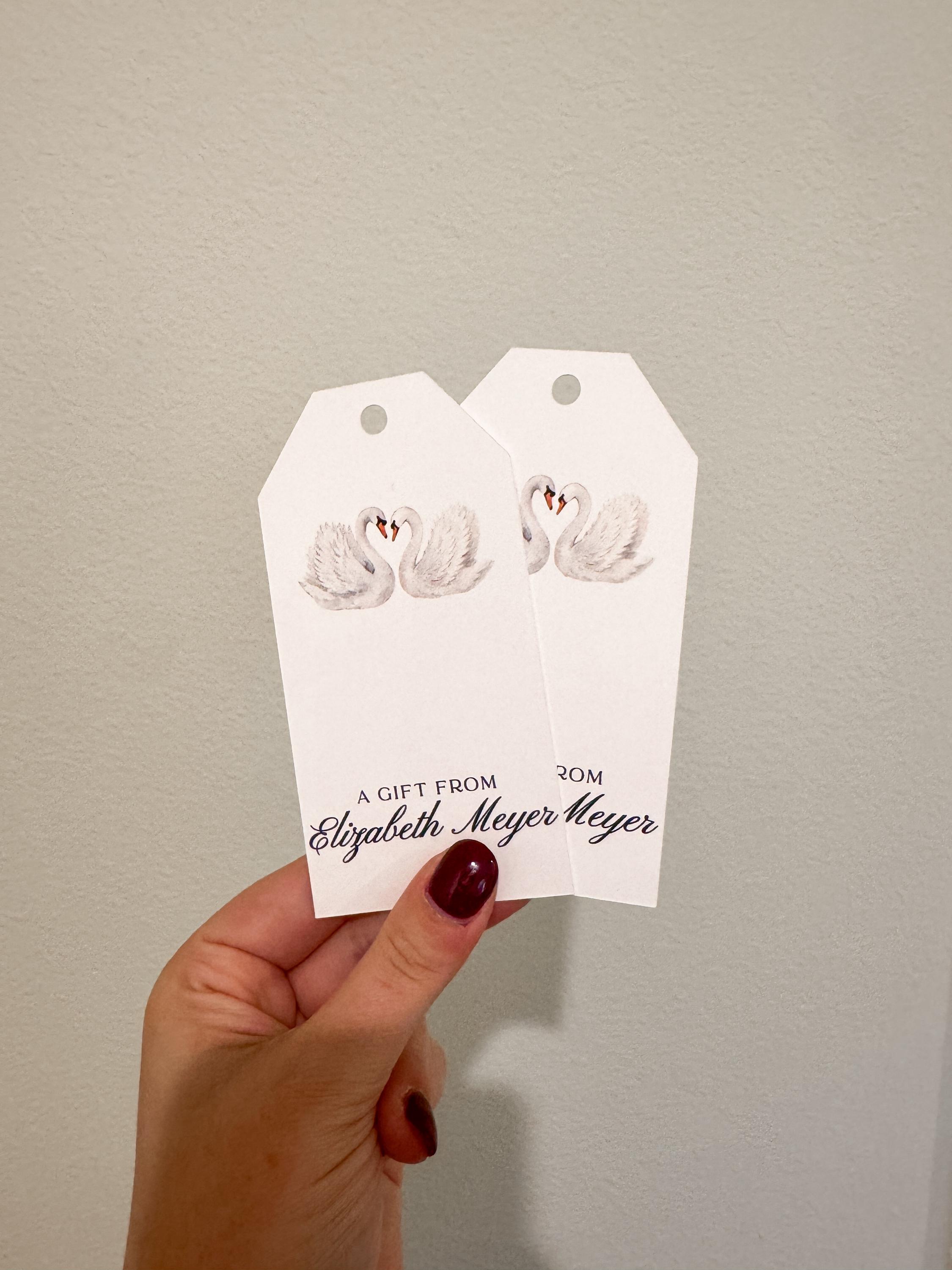 Add timeless elegance to your gifting with these personalized swan gift tags | Featuring a hand-painted watercolor pair of swans forming a heart, each tag is customized with your name or message for a romantic, graceful touch | Perfect for weddings, anniversaries, bridal showers, or thoughtful hostess gifts, each tag is created with care to reflect your personal style.