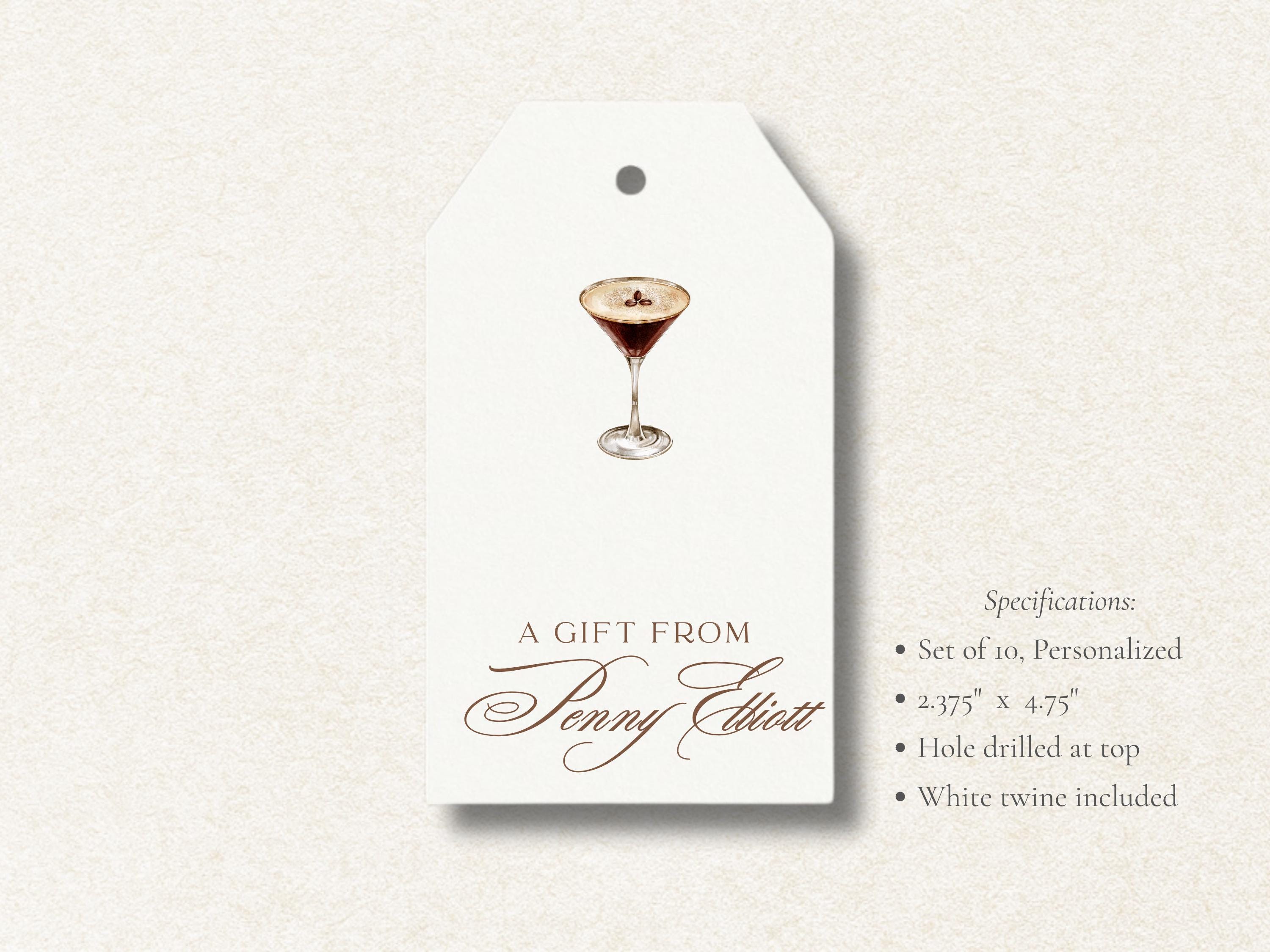 Add a stylish touch to your gifting with these personalized espresso martini gift tags | Featuring a hand-painted watercolor martini glass topped with coffee beans, each tag is customized with your name or message for a fun, cocktail-inspired style | Perfect for martini nights, cocktail parties, hostess gifts, or bar cart styling, each tag is created with care to reflect your personal taste.