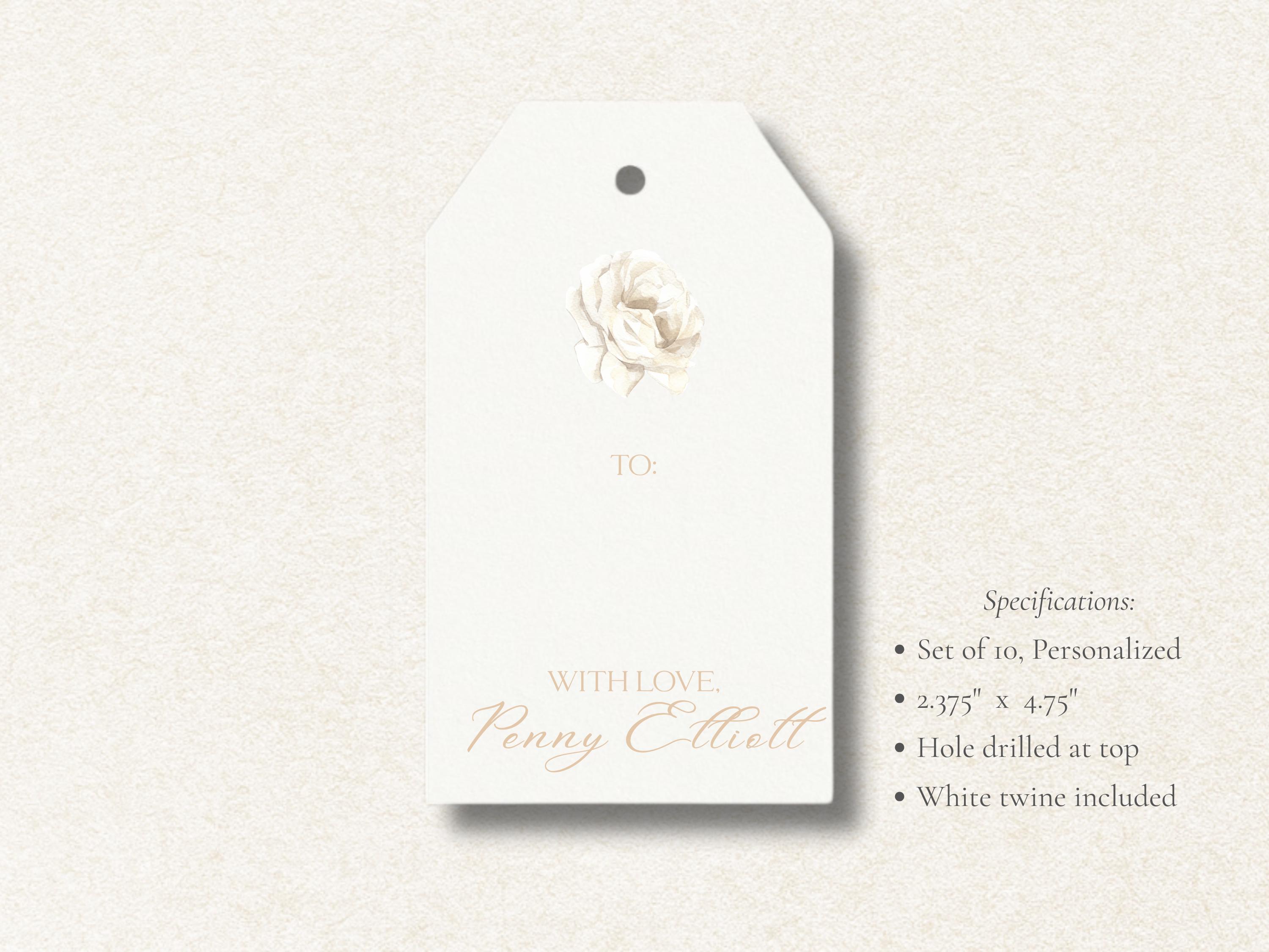 Add timeless elegance to your gifting with these personalized white rose gift tags | Featuring a hand-painted watercolor white rose, each tag is customized with your name or message for a refined, romantic touch | Perfect for weddings, bridal showers, anniversaries, or thoughtful hostess gifts, each tag is created with care to reflect your personal style.