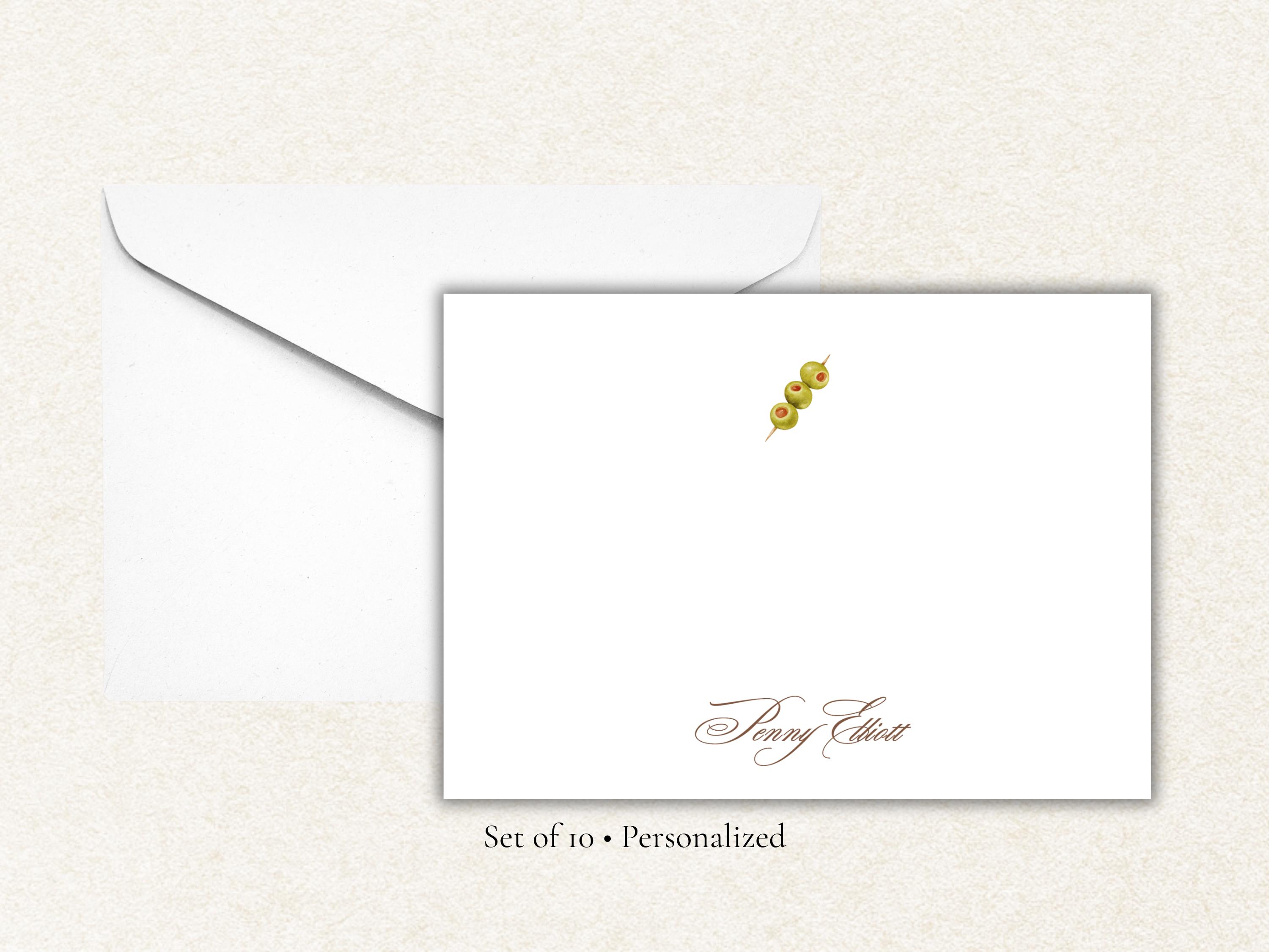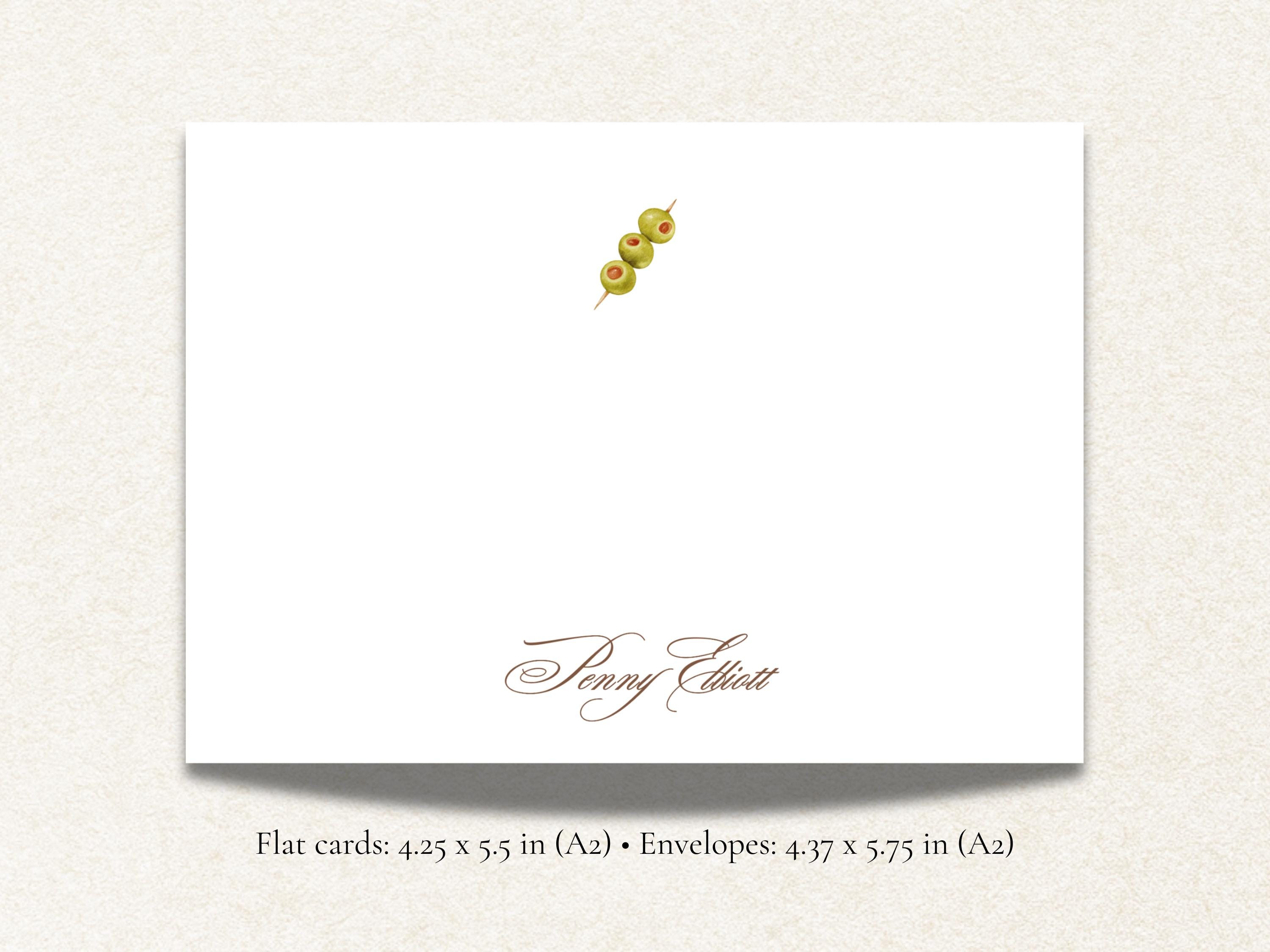 Add a chic, playful touch to your correspondence with this personalized martini olive stationery set. Featuring a watercolor olive garnish and your custom name in elegant script, these flat note cards are perfect for cocktail lovers, holiday hosts, or anyone who enjoys a stylish martini moment.