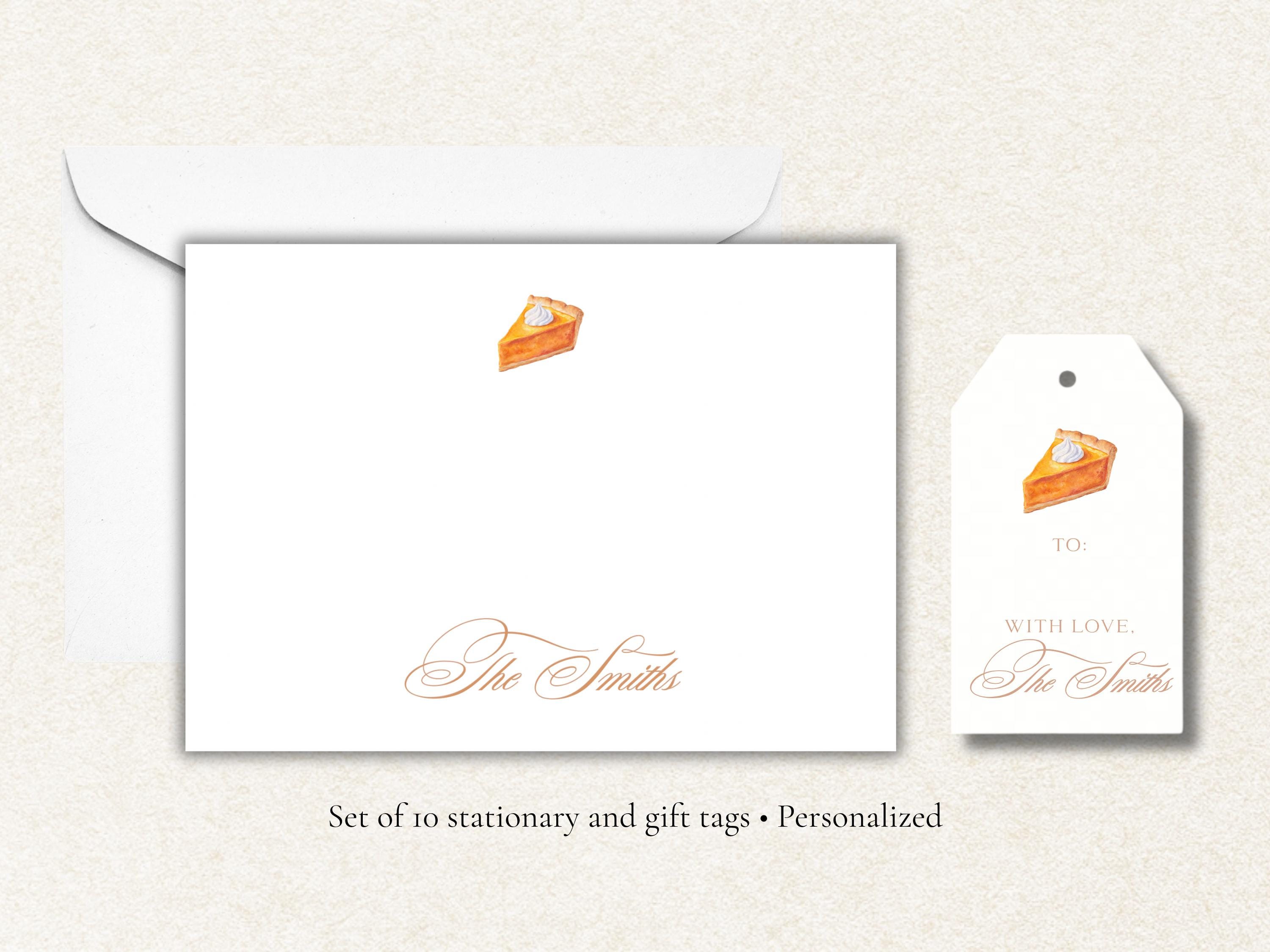Add a cozy, festive touch to your fall correspondence with this personalized pumpkin pie stationery and gift tag set.