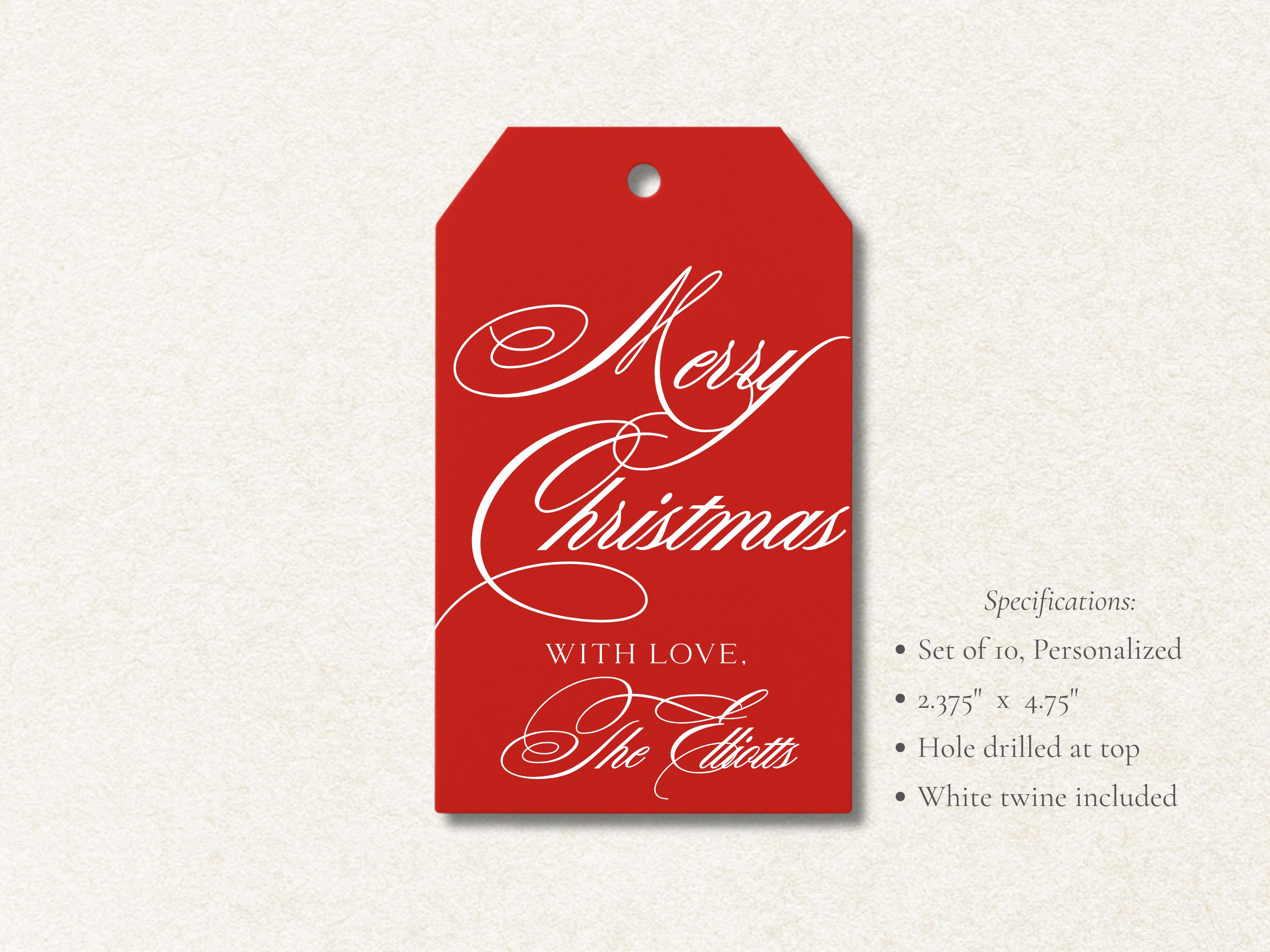 Bring timeless sophistication to your holiday wrapping with these personalized Merry Christmas gift tags. Featuring refined white script on a rich red background, each tag evokes the warmth and grace of traditional Christmas style, elegant, heartfelt, and beautifully personal.