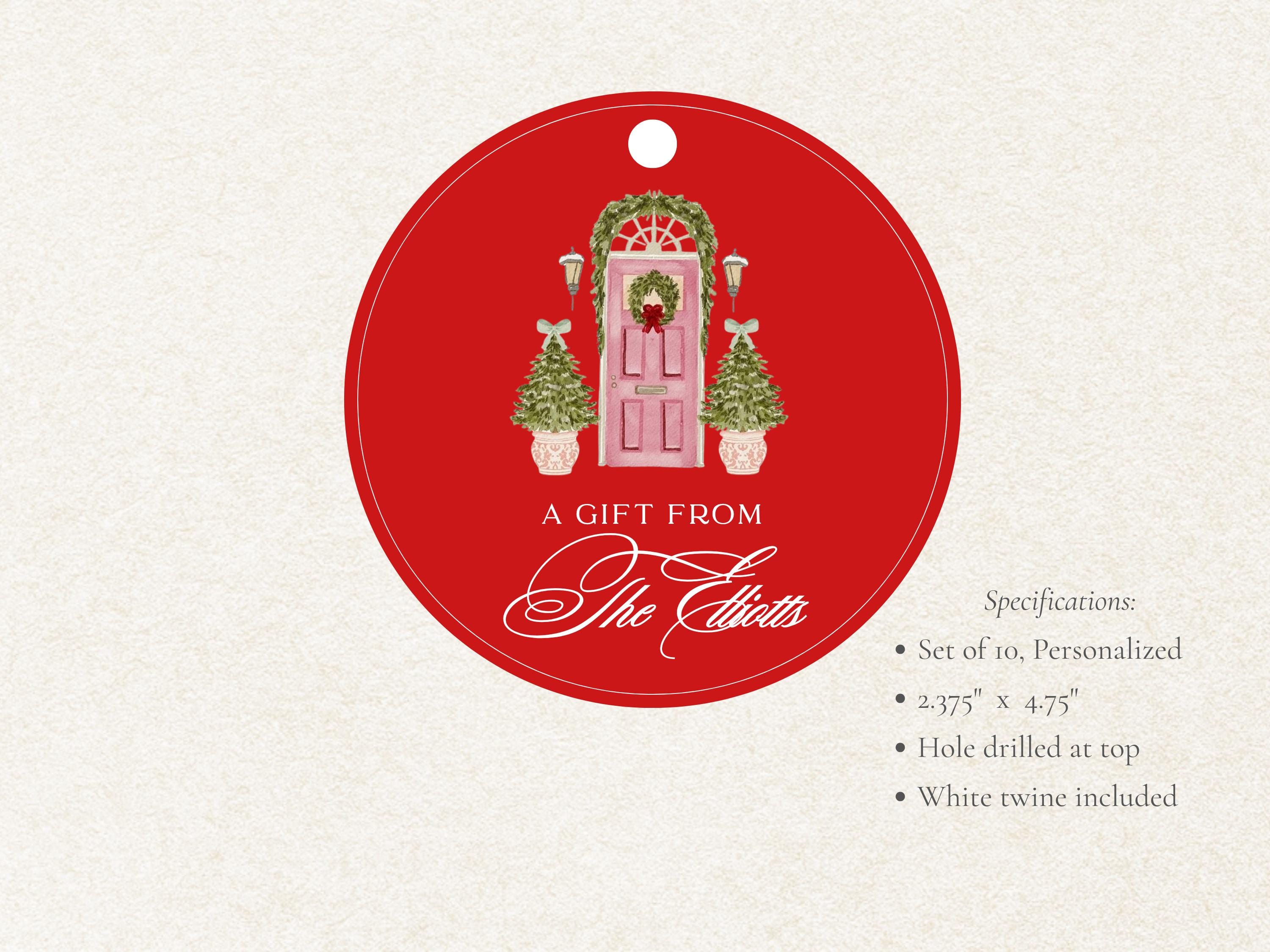 Welcome the season with these personalized Christmas Door gift tags, a nod to the warmth and tradition of coming home for the holidays. Featuring a pink door adorned with a festive wreath and topiaries, these tags bring charm and elegance to every gift they touch.
