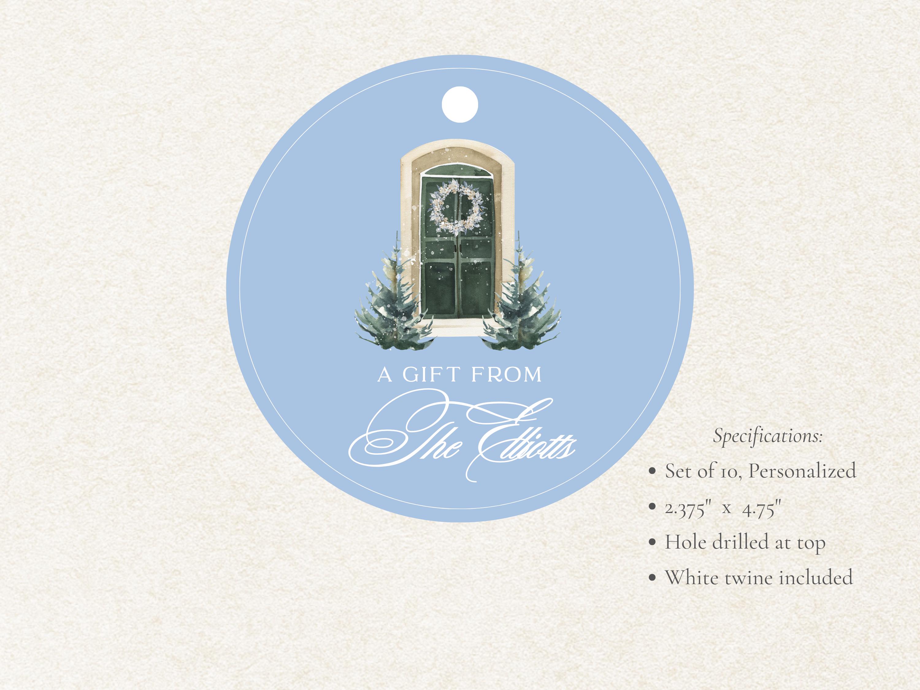 Bring a touch of timeless charm to your holiday gifting with these personalized Blue Christmas Door Gift Tags. Featuring a serene watercolor door adorned with a festive wreath and evergreens, this design captures the cozy elegance of the winter season, graceful, classic, and beautifully nostalgic.