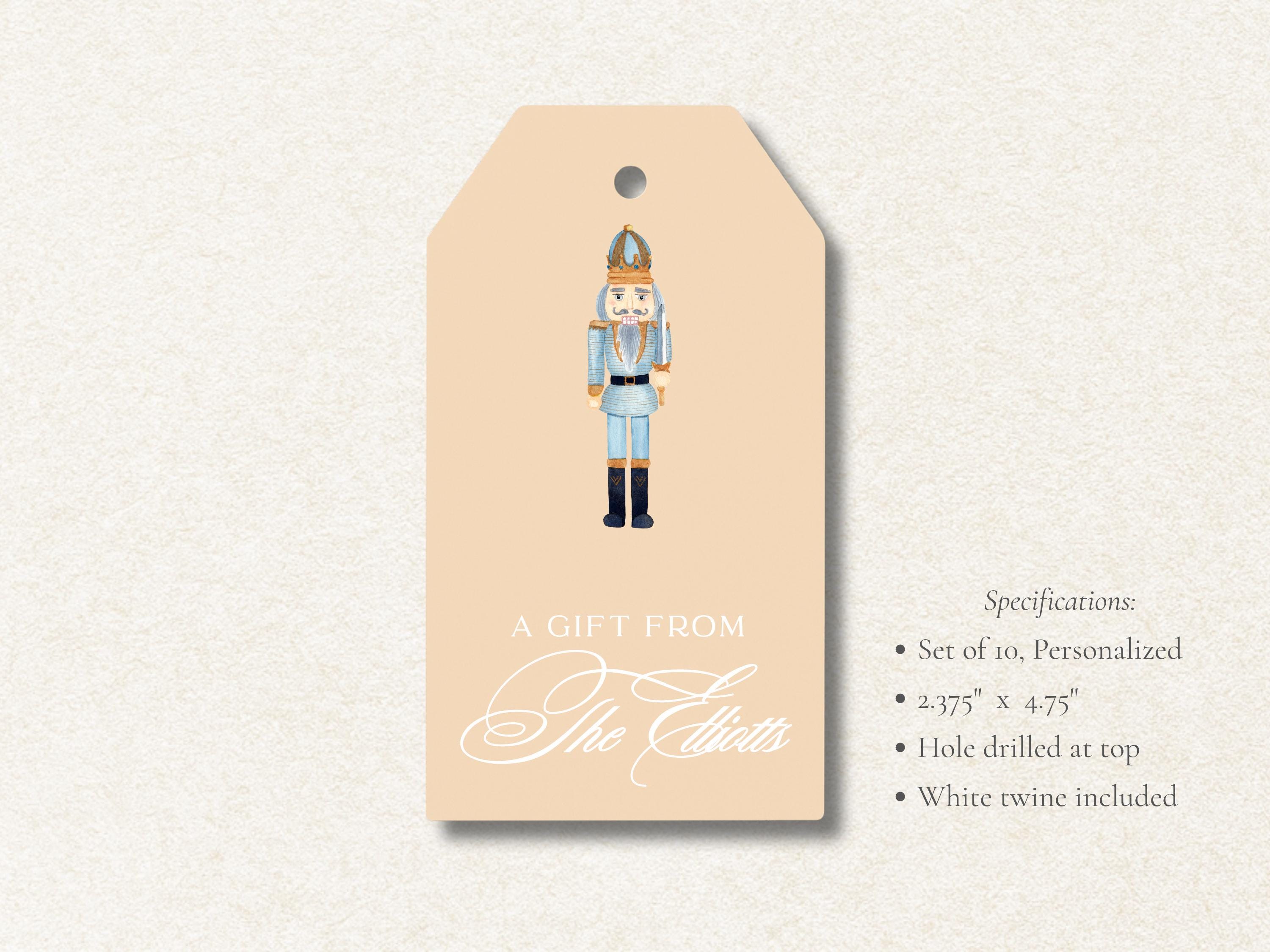 Add a touch of refined holiday charm to your wrapping with these personalized Nutcracker Christmas Gift Tags. Featuring a traditional blue nutcracker illustration on a warm biscuit background, this design blends timeless Christmas nostalgia with modern elegance, perfect for beautifully wrapped gifts and festive occasions.