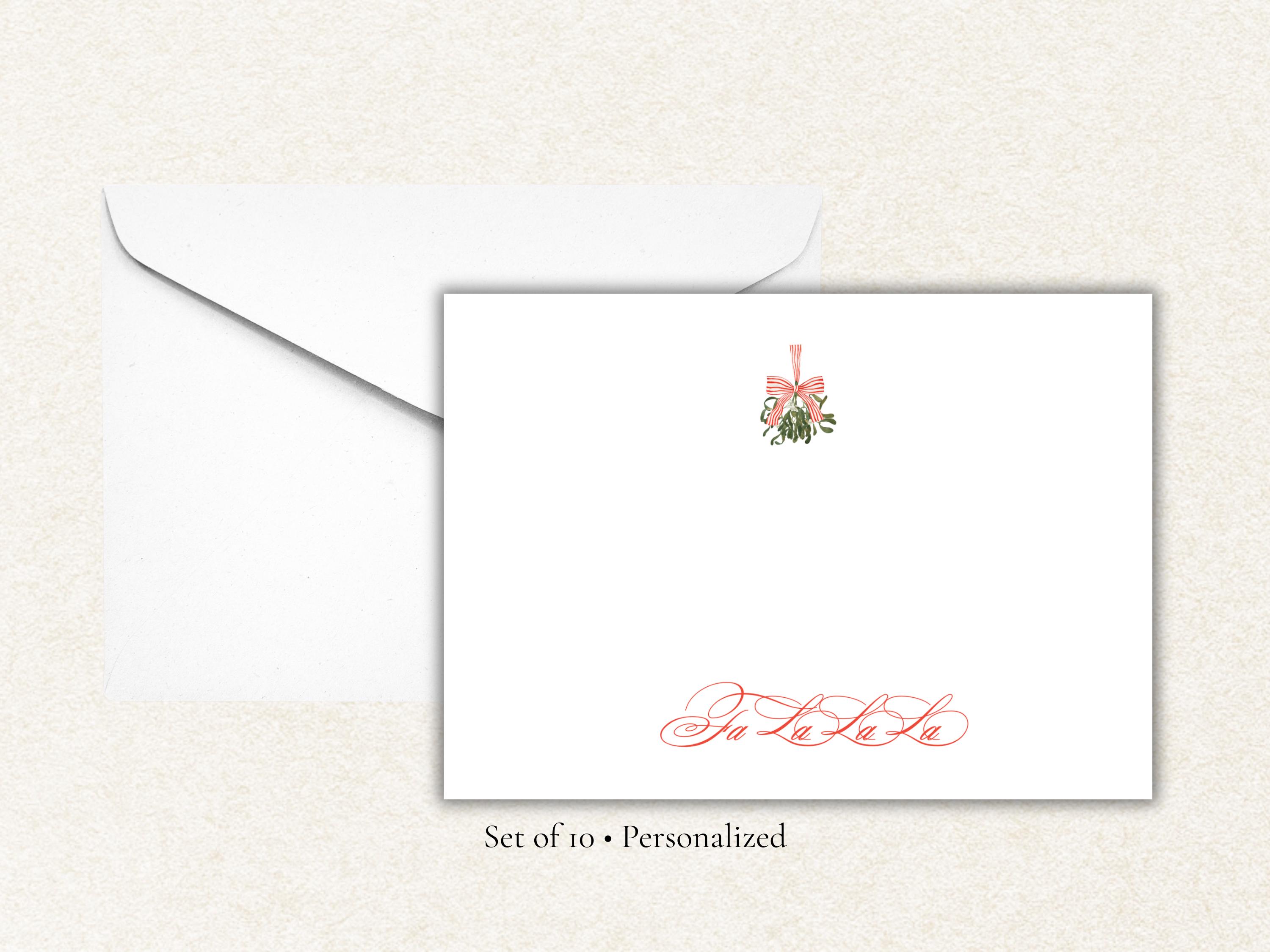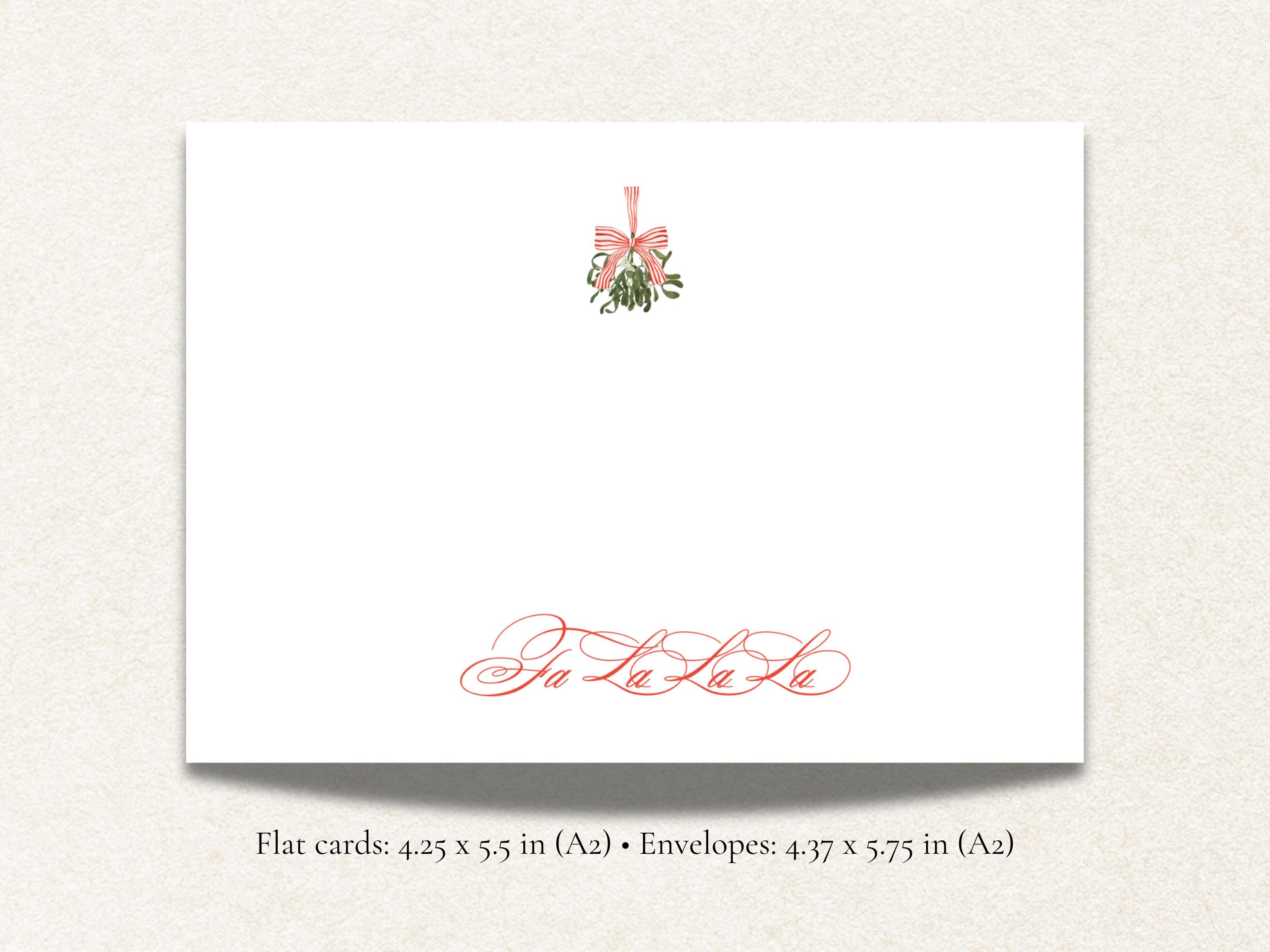 Spread holiday cheer in style with these personalized Fa La La Christmas notecards, a perfect blend of classic charm and festive sophistication. Featuring a dainty mistletoe illustration and elegant red script lettering, each card captures the spirit of the season with effortless grace.