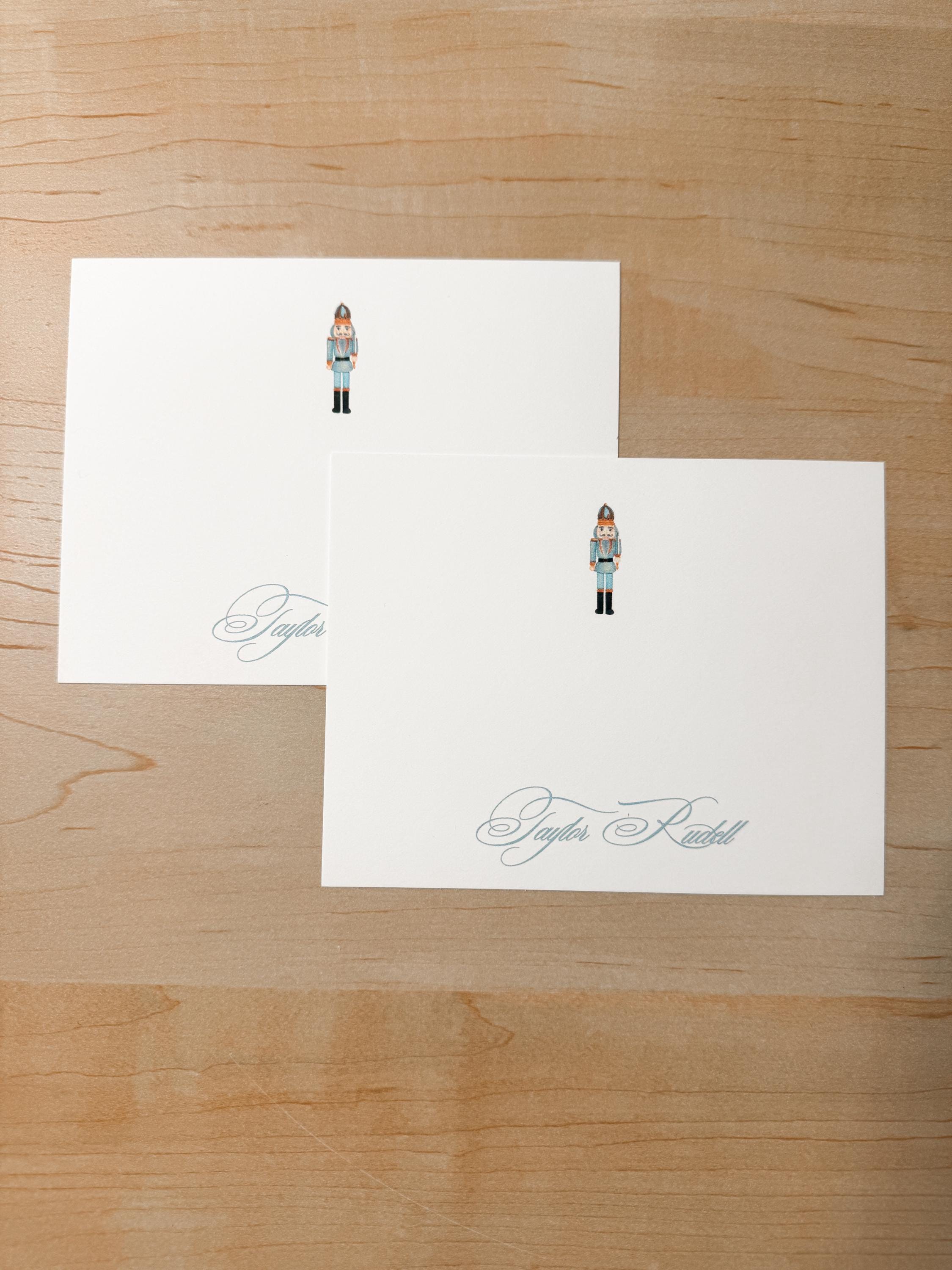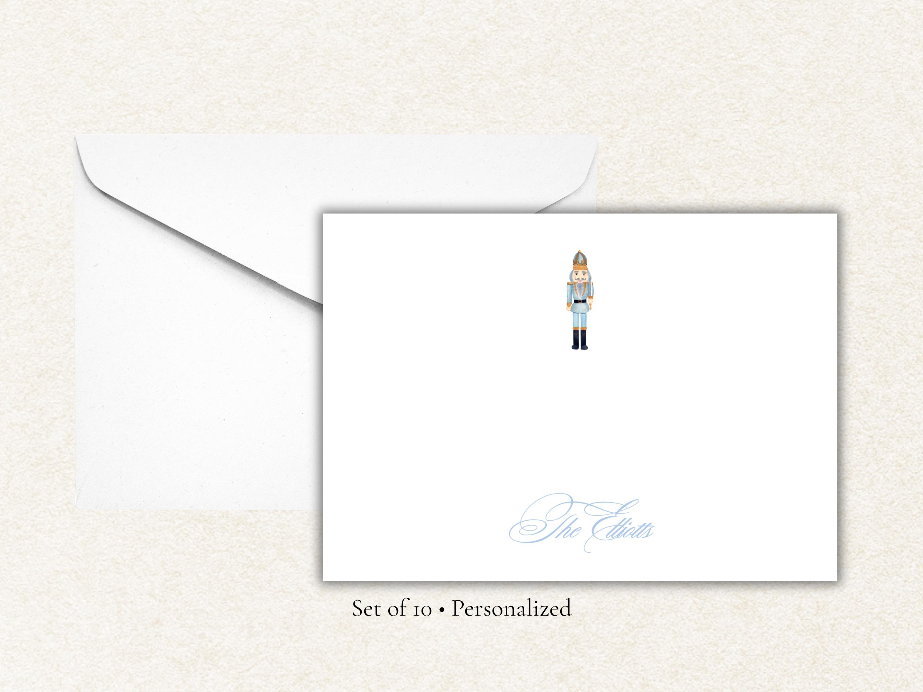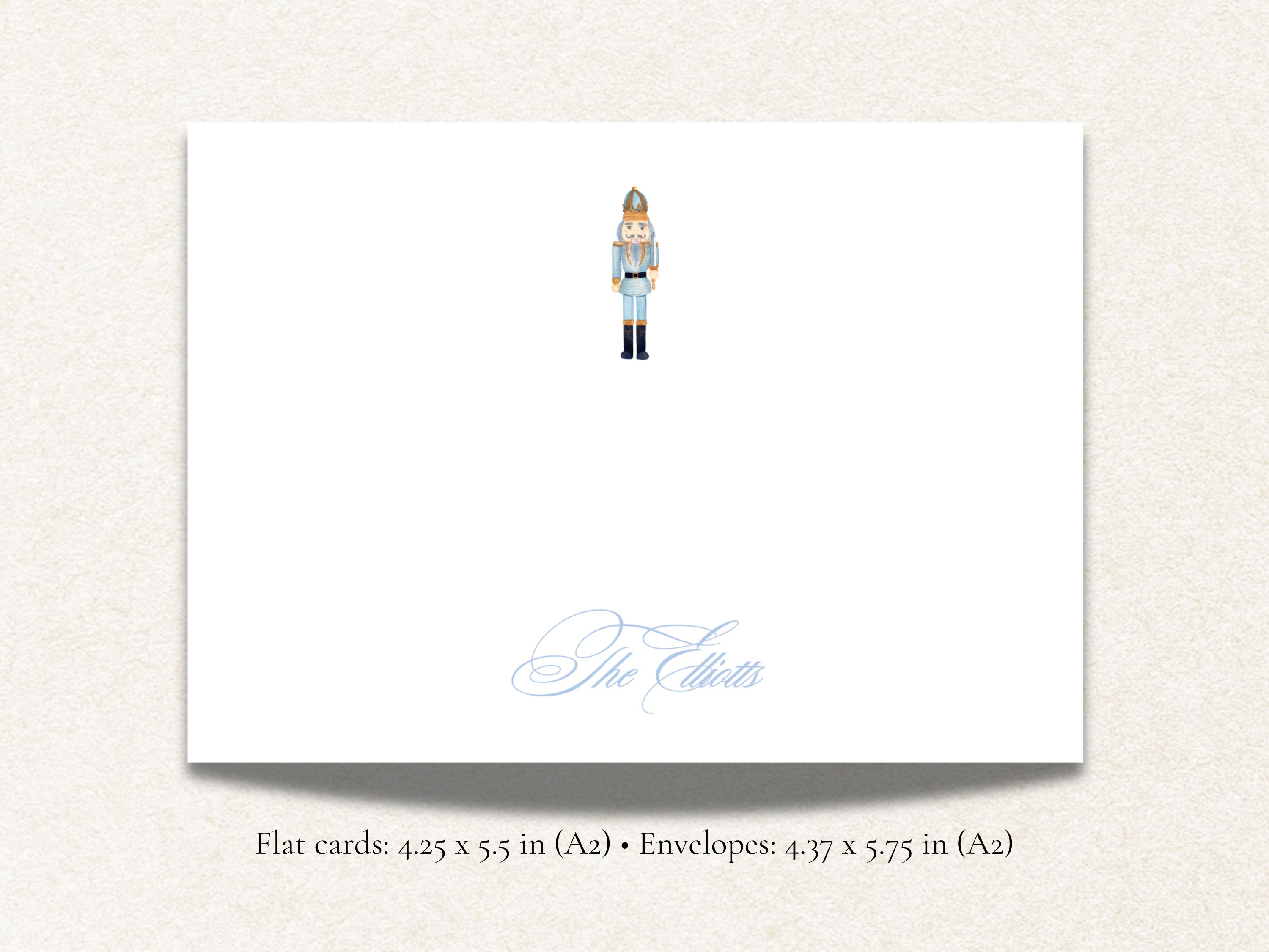 Celebrate the magic of the season with these personalized Nutcracker Christmas Notecards. Featuring a charming blue nutcracker design and elegant script lettering, each card blends classic Christmas tradition with a refined, modern touch.