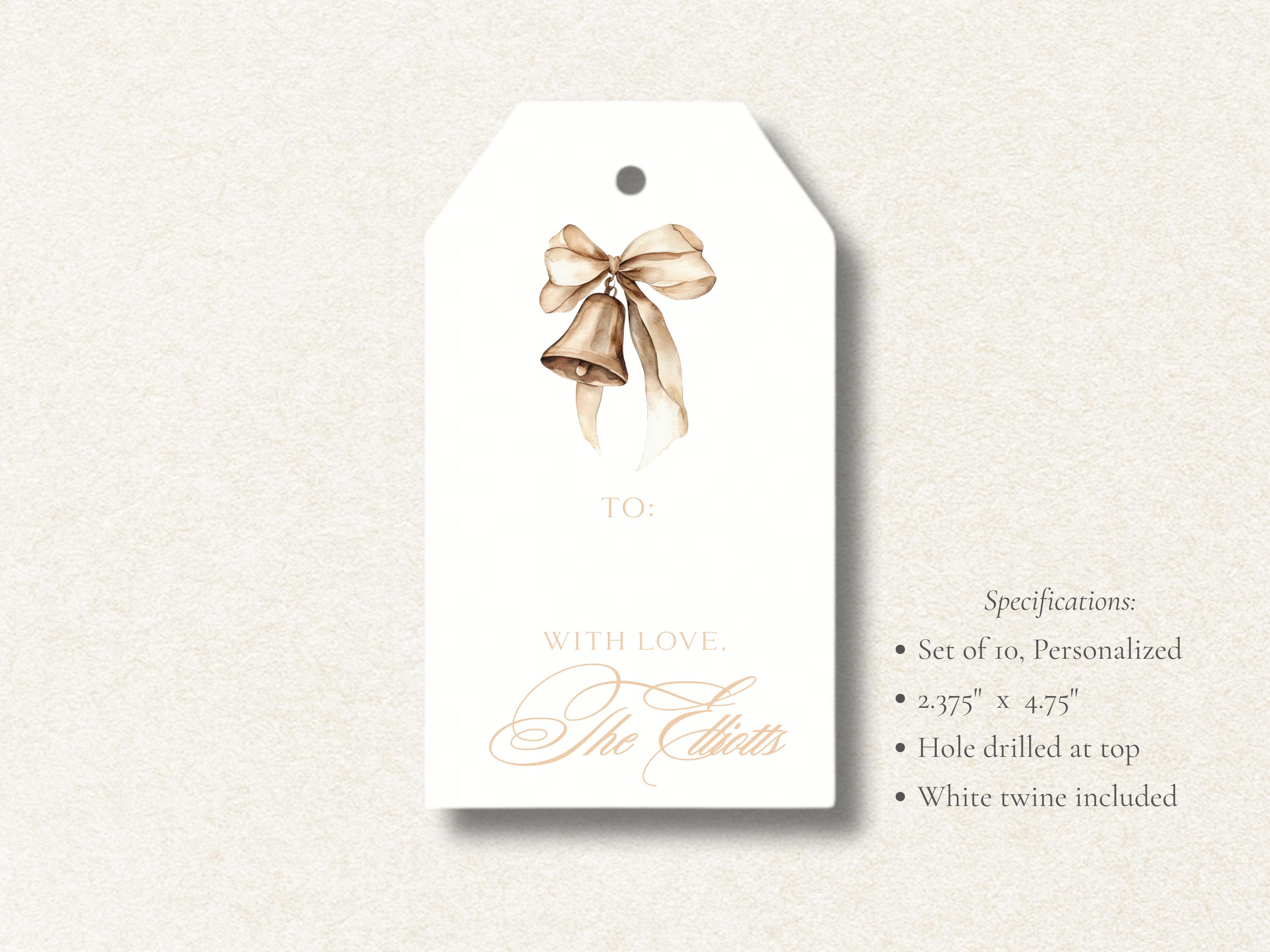 Add a touch of timeless holiday elegance to your wrapping with these personalized Christmas Bell Gift Tags. Featuring a soft gold bell and ribbon illustration paired with refined script lettering, each tag is designed to make your gifts feel thoughtful, polished, and beautifully personal.